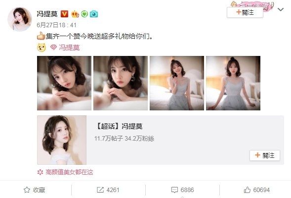 而近日她在微博分享了幾張自拍照,可以見到照片中的她趴在床上,角度十分引人遐想,還配上一串文字:「集齊一個讚今晚送超多禮物給你們。」讓粉絲們直接融化,紛紛表示晚上一定準時等她開播。