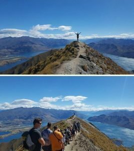 當你去旅行時,你自己會想要跟美麗的美景一起拍照呢?這張照片是在紐西蘭的羅伊山拍的。你可以去網上、朋友圈或其他社交群上找出上圖的照片。但真真的話可能會和你想的不一樣,就像是另一個照片一樣,有很多人都等著拍照,就是為了分享給自己的親朋好友。
