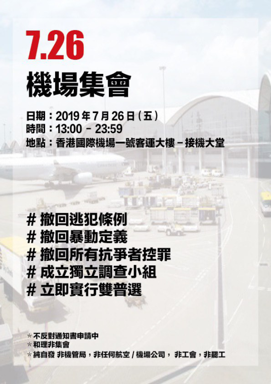 元朗「白衫恐襲」事件外間有不少團體、組織均對「白衣人無差別攻擊」事件發聲,希望政府能立即採取行動!周二及三就先後有網友在早上繁忙時間發起「不合作運動」,7月27日(星期六)齊齊到元朗一日遊,而7月26日(星期五)當天,就分別有醫護界、中大以及香港航空界發起集會;當中香港航空界職員所發起的「7.26機場集會」地點是接機大堂,有份參與的人士都十分和平及理性,完全沒有阻礙機場的正常運作!