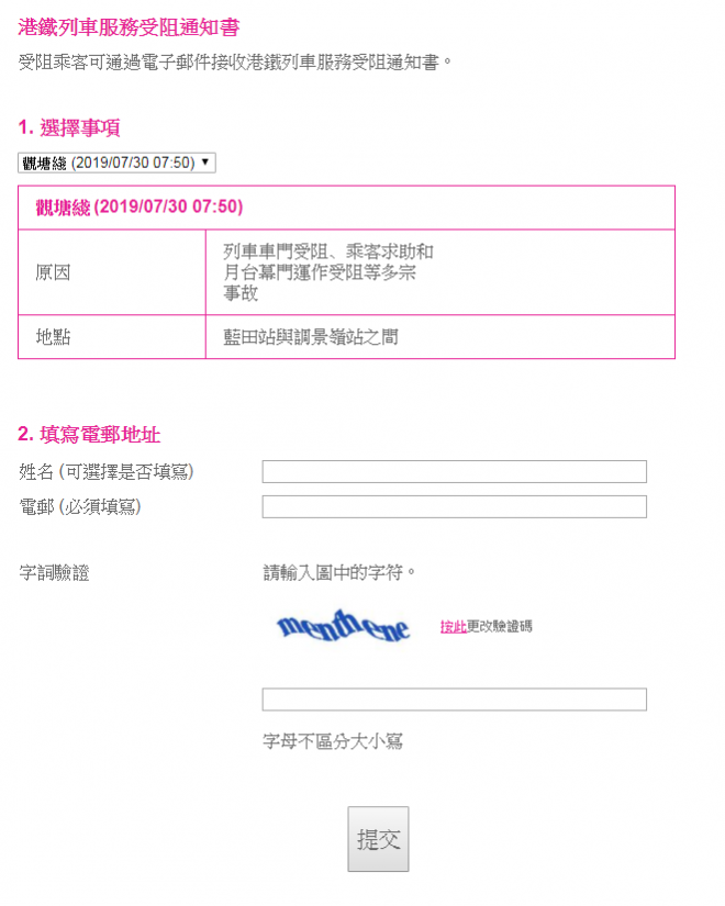 先到港鐵官網登記,然後選取受哪條綫所影響,填寫個人的電郵地址,最後填寫字詞驗就已經完成。完成以上步驟後,隔一回就會收到由港鐵所寄出的列車服務受阻通知書。
