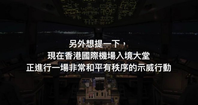 機場集會當天,國泰航空就有一班從日本東京飛回香港的航班,航班機長就開廣播,以英文來向機上的旅客講解航班的航程和提醒他們即將到達目的地外,還解釋當時香港機場的接機大堂正舉行和平示威,要旅客不用害怕,還籲旅客可與身穿黑衫的示威者溝通,能深入了解香港現時的社會局面。