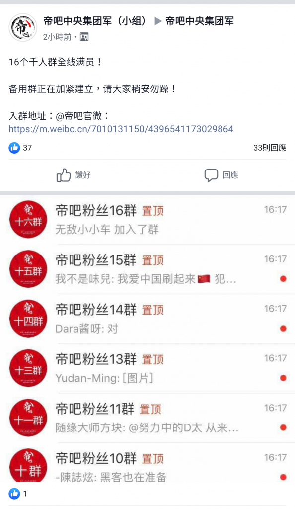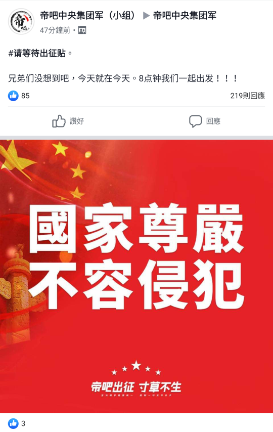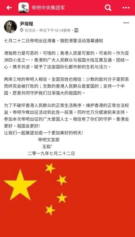 「帝吧」網軍對香港網民宣戰:「聲援香港警察,維護法制社會,反對暴力亂港,擁護一國兩制。」