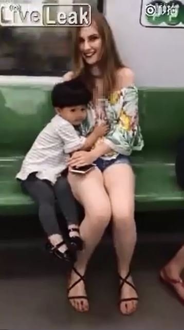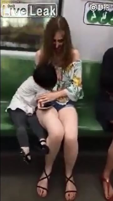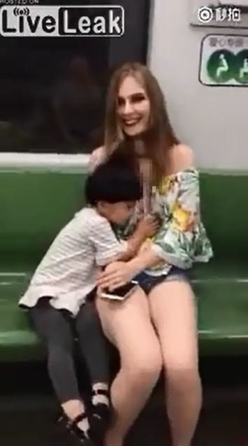 影片疑似是在大陸地鐵發生,一名小弟弟緊抱著金髮姐姐不放。