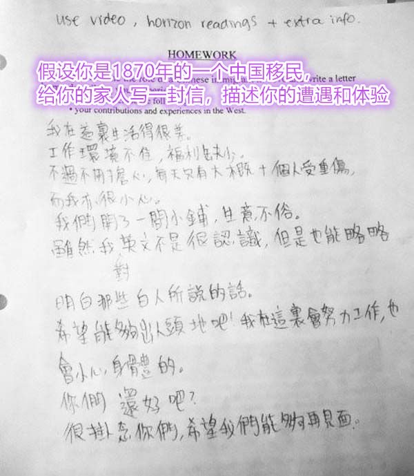 ...讓你假設自己是一個中國移民,沒讓你用中文去寫...畢竟這是一個英文作文作業啊喂!