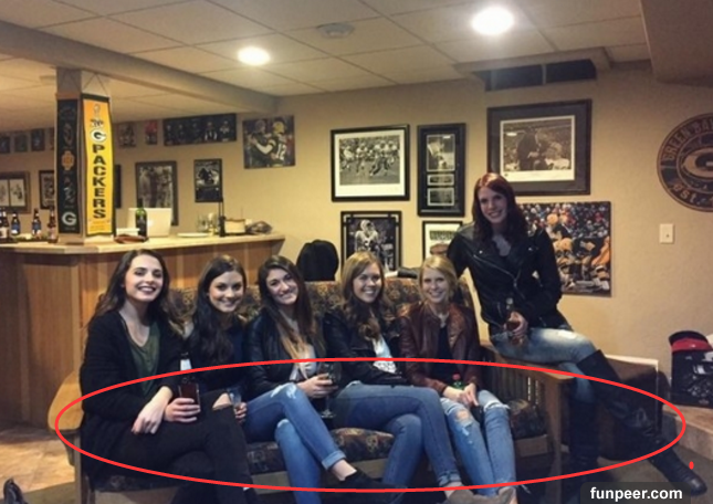 五個姑娘十隻奶,阿不是五個姑娘十隻腿,可是沙發上的那個五個女生,小編怎麼算怎麼看怎麼找都只有八條腿耶,你們可以幫幫小編嗎?
