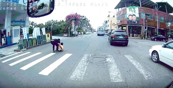 但他竟直接把男童扶起來,抱到路邊試圖讓男童站直