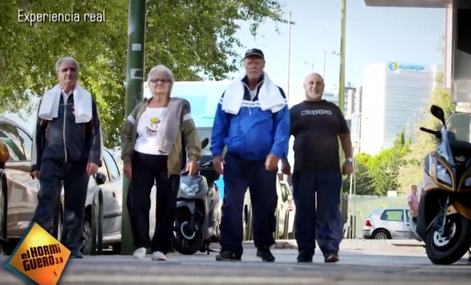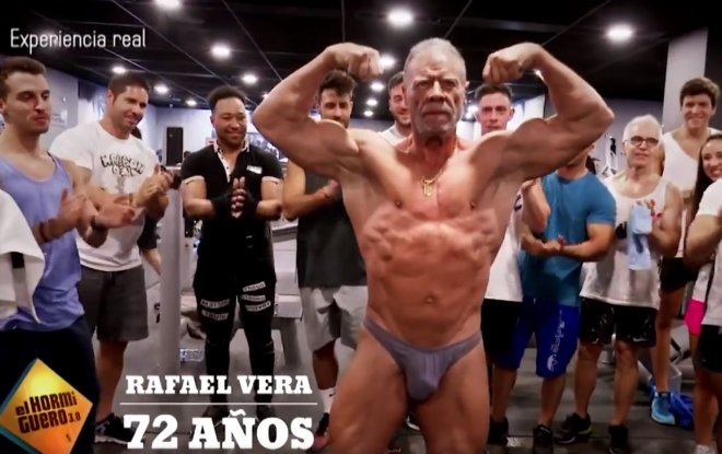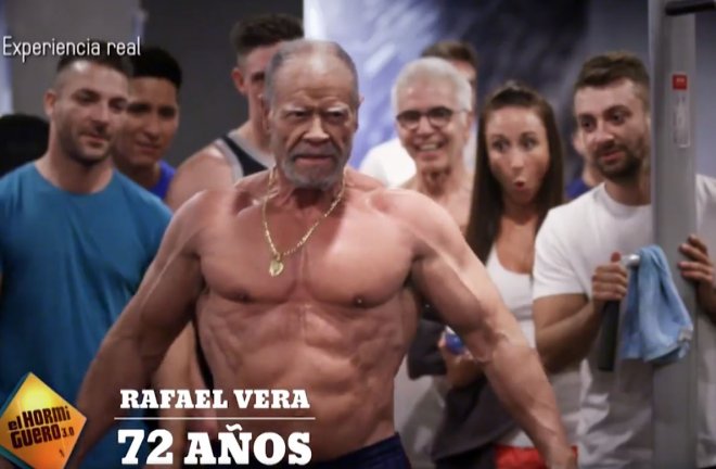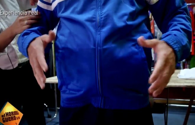 臉書粉專「El Hormiguero」日前就分享了一則影片,製作單位故意讓72歲的來賓Rafael vera穿上運動套裝,還在他的腰上塞滿棉花和棉布,