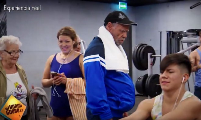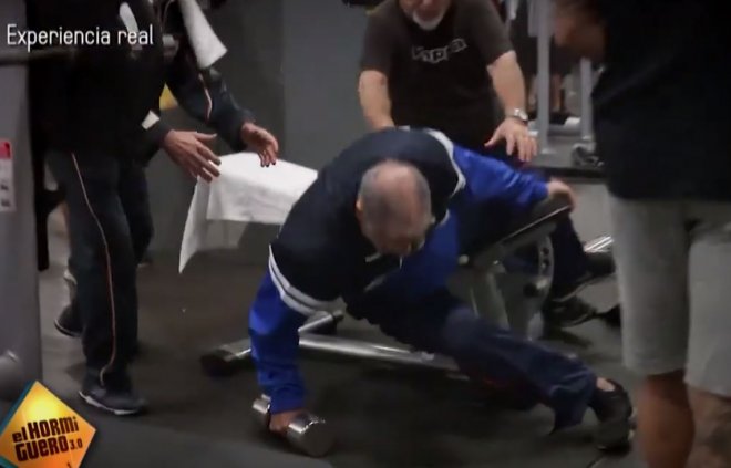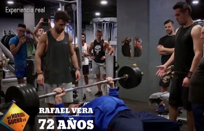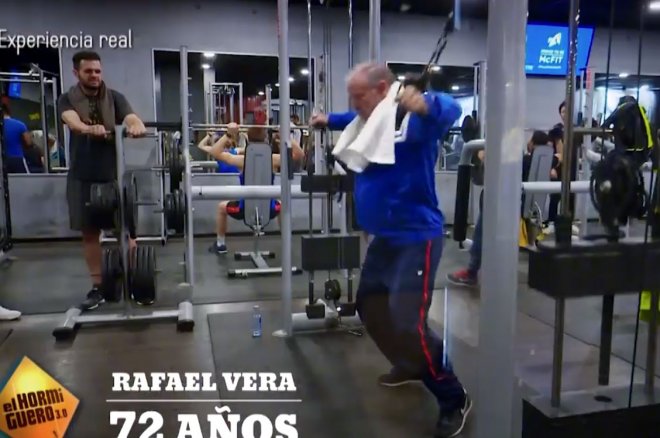 但Rafael vera全程還是表現的像個「頑固的老爺爺」,非要親自嘗試各種健身器材,