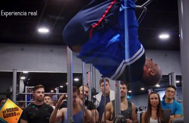 接著,Rafael vera還一連用了好幾個器材、整個人翻上單槓翻轉好幾圈,