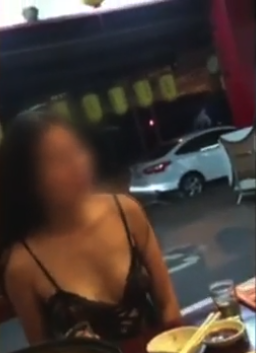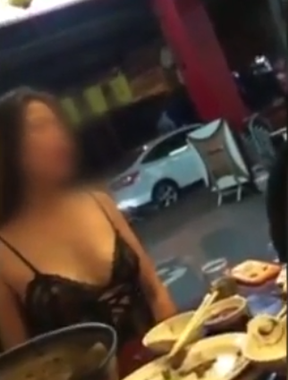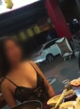 一開始在影片中可以看到一位面貌姣好的的女子,就這樣坐在薑母鴨店裡,往下一看還竟然只穿了性感內衣,胸前美乳若隱若現。