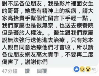 影片中女主角哥哥也特地留言說明,表示女生的確有精神上的疾病,希望大家高抬貴手,不要再攻擊或謾罵她的妹妹,也希望這場鬧劇可以盡快告一段落...