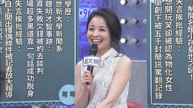 30(五)中天綜合台晚間10點《小明星大跟班》播出主題「鄉民最愛罵他們87,藝人VS.記者面子之戰」邀請藝人沈玉琳、楊晨熙、綠茶與黃喬歆,以及曾擔任過記者,現為名嘴的來賓張友驊、呂文婉、楊皓如與彭華幹,上節目分享自己的聰明事蹟及失言討罵的小故事,其中名嘴呂文婉自曝,曾因欠錢和朋友約談判,沒想到來的卻是黑道,回嗆:「真的快嚇哭了!」表面還是故作鎮定,對黑道說:「今天把我殺了ok啊,我一了百了,但是你們一毛都拿不到!」豁出去的一句話,讓呂文婉驚險脫身。