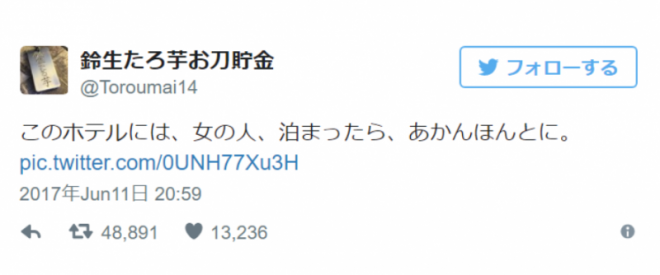 日本一位推主在自己的推特上以「女生絕對不能去住這間飯店」為題,講述了自己遇到的恐怖經歷。