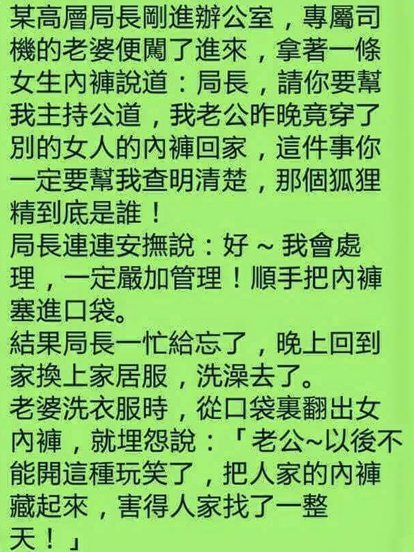 司機老婆拿著一條內褲,衝進局長辦公室說要討公道?