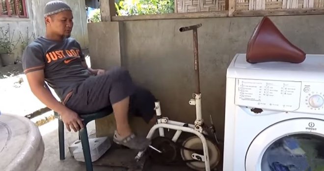 看看影片中的男子有多聰明,他把腳踏車的鍊子與洗衣機做結合,當他踩著腳踏板時洗衣機就會跟著滾動,踏板反轉時洗衣機也跟著反方向滾動,真是既省電又可以運動呀!而且不管順著踏、逆著踏,都讓腿部訓練到不同的肌肉群,真是厲害!