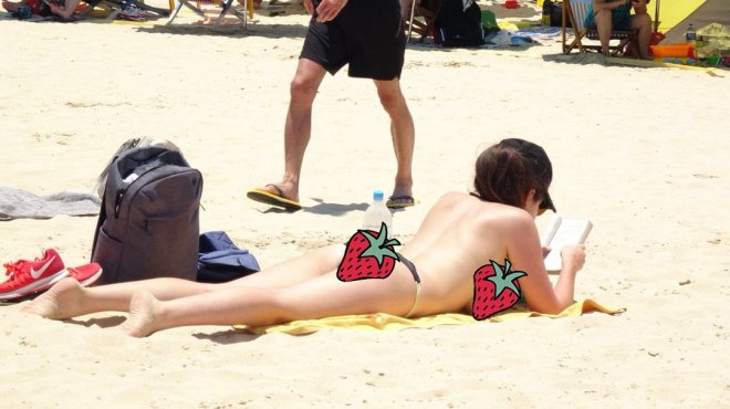 夏日消暑靚女們穿著三點式前總要花時間好好檢查自己嘅「鮑魚」。照片中,呢位皮膚白滑嘅靚女岩岩潛完水返緊上岸。
