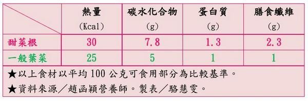 特別的是,雖然被歸類為「蔬菜類」,但甜菜根的營養密度卻比一般葉菜高出一大截。趙函穎營養師說明,一般葉菜類蔬菜,每100公克約含熱量25大卡、碳水化合物5公克、蛋白質1公克、膳食纖維1公克;但屬於根莖類蔬菜的甜菜根,平均每100公克卻約含熱量30大卡、碳水化合物7.8公克、蛋白質1.3公克、膳食纖維2.3公克。