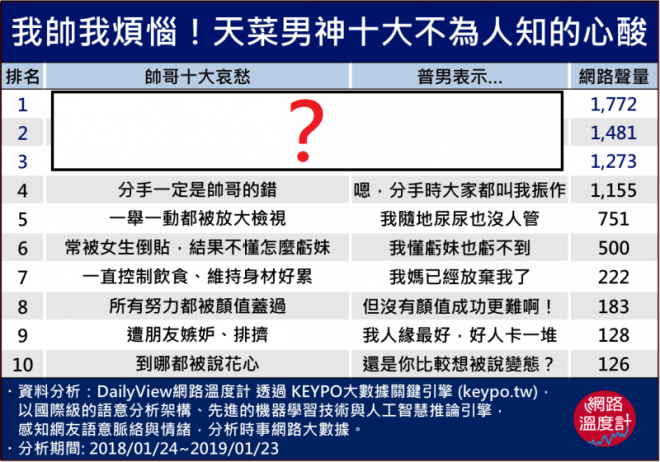 系統觀測上萬個網站頻道,包括新聞頻道、Facebook、PTT及各大討論區、部落格等,針對討論『帥哥/男神/天菜/小鮮肉的煩惱』相關文本進行分析,並根據網友就該議題之討論,作為本分析依據。
