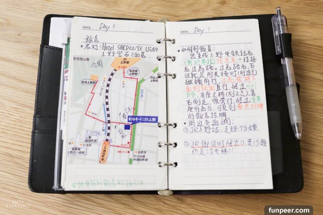 (5)建議將每天行程以小本子書寫。書寫內容以天為單位,從每天早上預計幾點起床/出發,然後今天要去哪些目的地,從哪個車站出發,搭乘的交通線路/費用(有軟體可查),還有中餐/晚餐想吃啥、餐廳位置,餐點價位(一堆網友分享),甚至沿途你想拍啥照片,有啥必買好物、必看美景,你都可以註記進去。