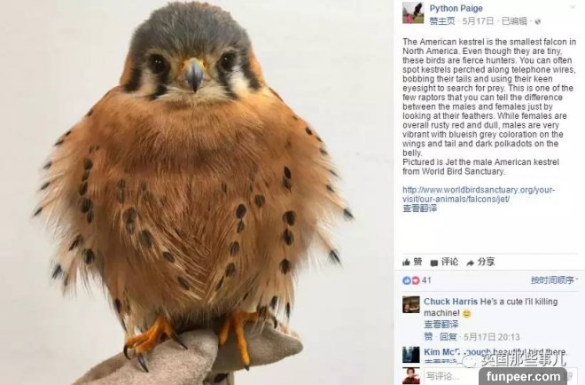 美洲隼『我們的小Ace美洲隼正在學習如何盤旋。對隼來說,在一小塊領地上來回盤旋是自然行為,它們在尋找一個完美的時間衝下去捕獵。正在教Ace的是動物學家Paige Davis,她將一塊食物用繩子來回甩,讓Ace練習盤旋。』