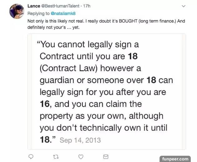 還有人開始分析他們的資產狀況。。。 「從法律上講,你在18歲以前是沒有權利簽合同的,但是你16歲以後你的監護人可以幫你簽,而且你還可以宣布這些財產是屬於你的。不過技術上而言,你還是要等到18歲才可以正式擁有這棟房子。」