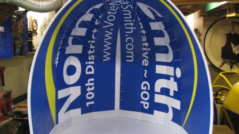 但是小拖車若沒有遮陽避雨的地方也沒辦法休息,於是保羅就發揮他的巧思,把路上廢棄的廣告看板拿來當作屋頂!他先切割好適當的大小後,再用電纜線緊緊地綑死,而底盤則去買30元的木板,在把腳踏車上的輪子拆下來裝上去,看板表面再黏上塑膠布,新的家就這樣誕生了!