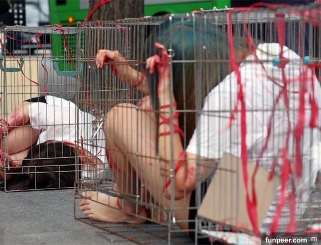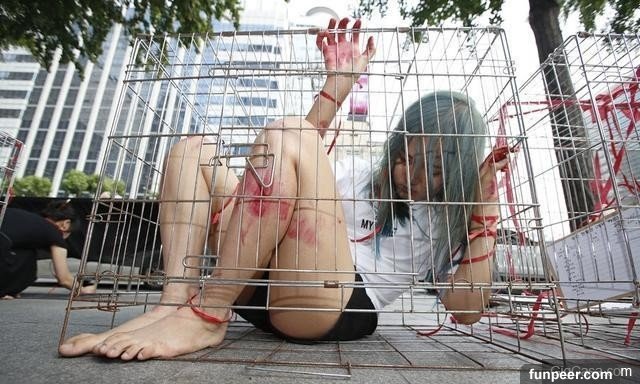 在韓國街頭上就有許多少女被關在牢籠裡,手腳被捆綁,滿身是傷的蜷曲著躺在狹載的牢籠裡。這些少女不是被變態關在裏面,也不是什麼明星的另類打歌宣傳,而是她們想要社會大眾的關注。 ▼牢籠少女