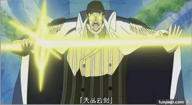 黄猿的天丛云剑黄猿用能力光聚成的一把光剑,用来攻击目标。叫做天丛云剑,不知道和神器有什么联系,会不会就是一把,亦或者只是同名,不过在香波底群岛,确实黄猿大叔给我们带来太多的震撼,大将果然不是盖的,踩着炮弹登场,腿功无敌,掏出天丛云剑对战雷利游刃有余,当时就知道这个人物会有着很大的隐藏。