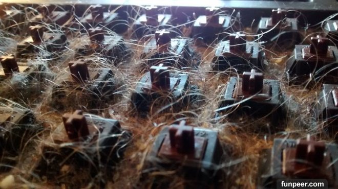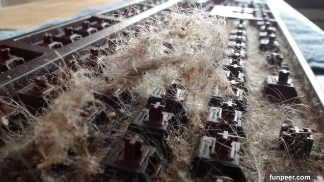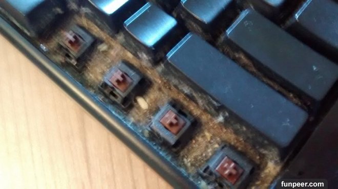 原來鍵盤裡都卡了他之前吃過的食物殘渣,甚至還有一粒完整的米…