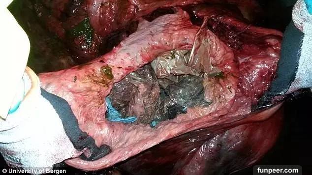 當地科學家趕到現場時這頭痛苦的鯨魚已經無法挽救只能將其安樂死 當科學家剝開鯨魚的肚子卻發現這條鯨魚的胃裡,整整塞滿了30個塑料袋! 同時發現的還有長達9米的長繩,花盆甚至,還有一團超過30平方米的塑料布...