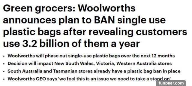 Woolworths宣布: #未來12個月內,新州、維州和西澳境內, 我們將逐步禁用塑料袋,改用成本更高的環保袋! 到時候出錢也買不到塑料袋!# 消息一出,全澳洲的媒體炸了鍋!