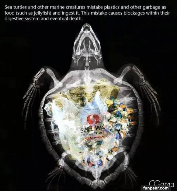像鯨魚這種體型大靠吃浮游生物為生的生物經常一不小心就 吞下一肚子的塑料製品 更不用說好奇心重的海豚以及眼神不好的海龜了!