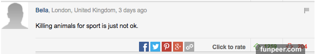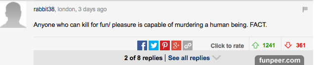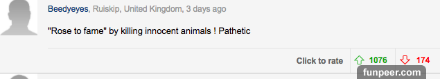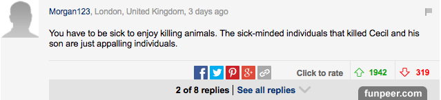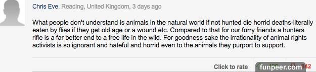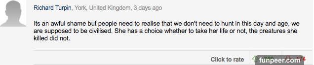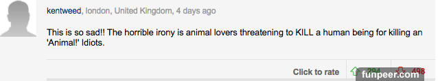 而這些評論中,最令人印象深刻的是這個。 「這真是一個悲傷的故事,那些聲稱熱愛動物的人將一個殺死動物的人殺死了。」