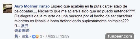「為啥人們就不理解,在自然世界,動物也會老死或者受傷而死啊。比起這些死亡,被獵人殺死並不是一個很壞的結果啊。那些非理性的保護動物的人真是特別無知而可笑。」