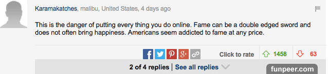 也有一些人為Melania所遭受的網絡暴力而感到遺憾.. 「現在把所有生活放在網上絕對是非常危險的,名聲是把雙刃劍,通常不會帶來快樂。很多美國人都為了獲得名聲而不惜任何代價…」