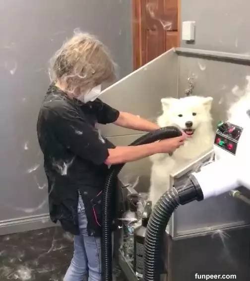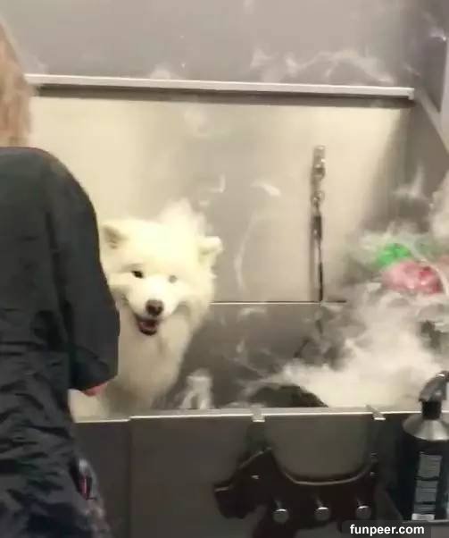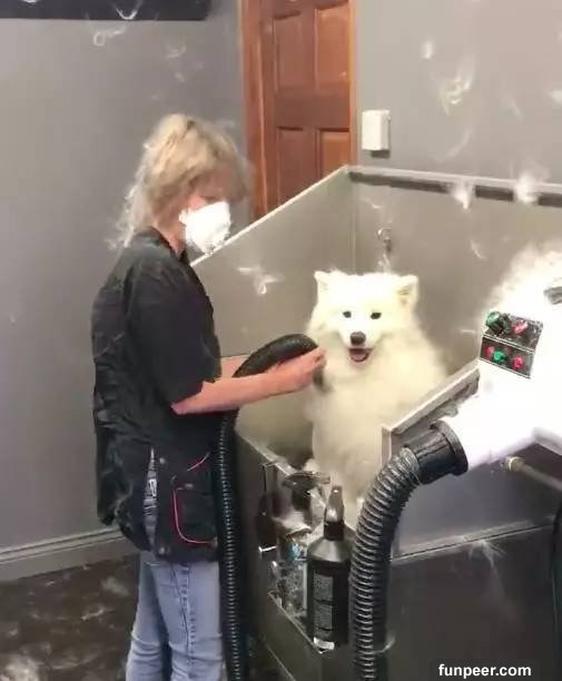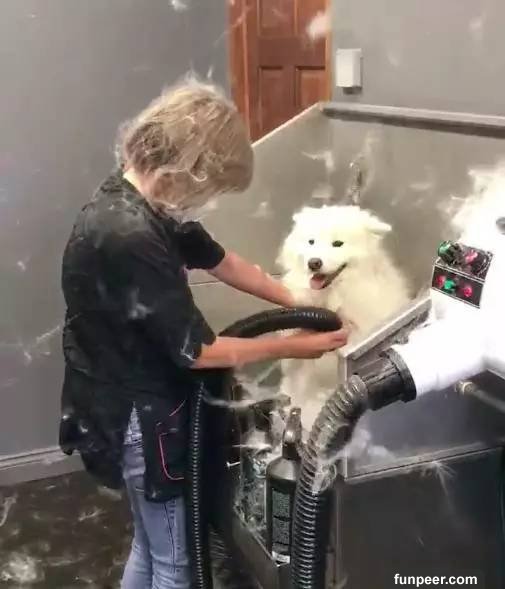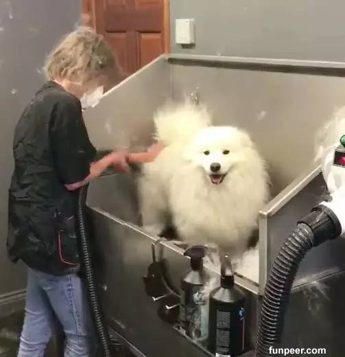 養了雪橇犬的盆友一定有過這樣的感受,給它們洗個澡就像跑了幾公里,渾身濕透不說,還滿嘴狗毛! 下面這只薩摩名叫 Yogi,別看它現在渾身雪白的毛特別漂亮,一旦到了換毛季,能脫毛脫到你哭!