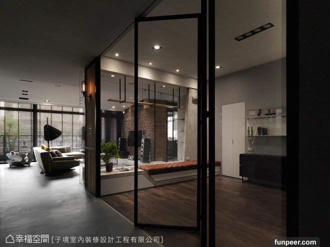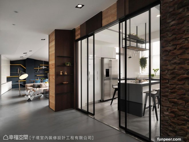 貓大哥的最愛03. 穿透感公共空間許多家庭都會選擇以開放式設計規劃公共空間,來延展室內寬闊度,本案除了利用開放式手法,貓房、書房及廚房皆採清玻璃作穿透式隔間,一方面使空間更加通透無阻,另一方面則方便自然光貫穿全室。而廚房空間除了以清玻拉門介定場域外,壁面更特意拼以三種異材質面板設計,表現工業風粗獷意象,復刻老舊倉庫的復古韻味。