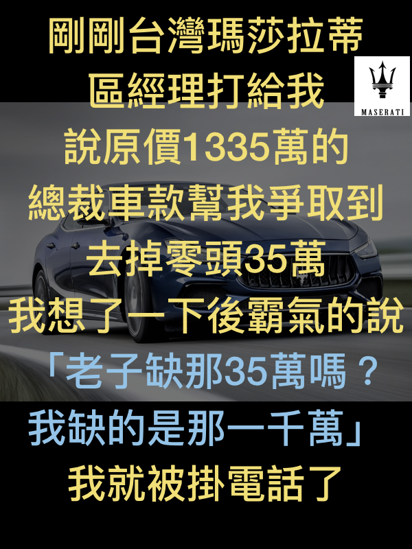 瑪莎拉蒂區經理幫我爭取到35萬折扣 我一句話就讓他掛上電話