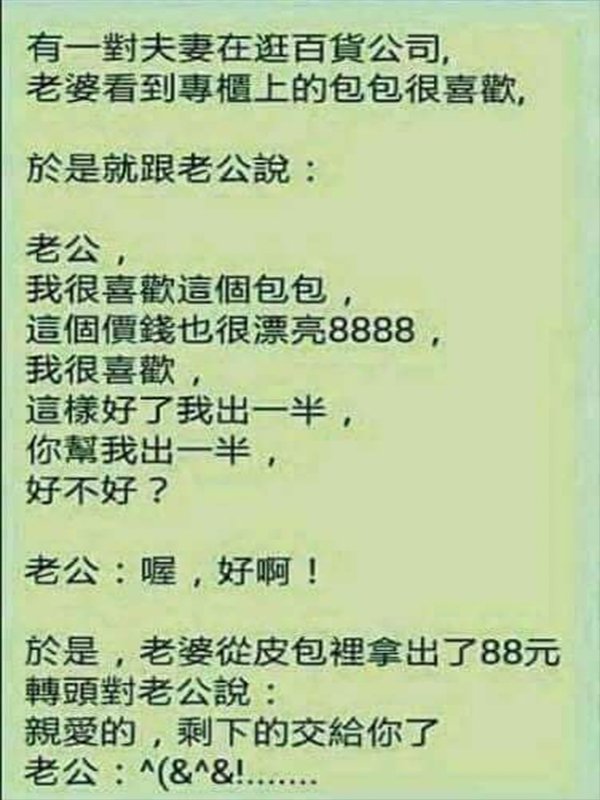 老婆逛街看到專櫃上的包包很喜歡,於是撒嬌跟老公說能不能幫她出一半?