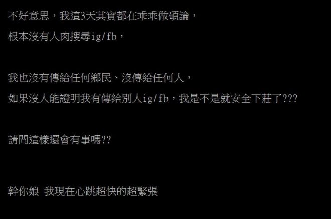 1個多小時後,碩士男再次發文,疑似是擔心觸犯刑法遭起訴,開始否認所有的行徑,改口宣稱這3天其實都在忙著處理碩士論文,根本沒有肉搜群交趴參與者,也沒把FB和IG連結傳給其他網友,「如果沒人能證明我有傳給別人IG、FB,我是不是就安全下莊了?請問這樣還會有事嗎?X你娘,我現在心跳超快的超緊張。」