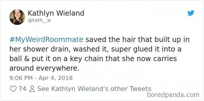 我的室友把塞在浴室下水道的頭髮收集起來,洗乾淨,粘合成一個球,然後放在一個鑰匙扣裡隨身帶著。