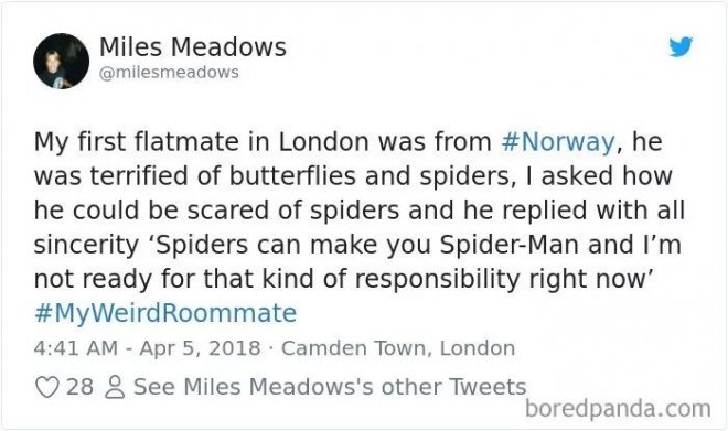 我第一個室友來自挪威,他非常害怕蝴蝶和蜘蛛,