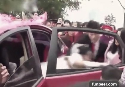 這段迎娶新娘的影片中,大批親友團早已經在現場準備,禮車緩緩開入後,眾人笑得好開心,打算給新人送上祝福!怎料到新郎一打開車門,表情怒氣沖沖,二話不說就把新娘跩下車,穿著長禮服的新娘差點踉蹌跌倒,新郎接著對她怒吼!