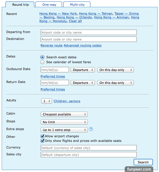 當想使用 Currency Glitch 去製作一張平價機票,以原價的三份二去買機票時,Google ITA 也可以幫上忙。底部 Sales City 就是讓我們假裝從不同地點購票的方法,可以填上