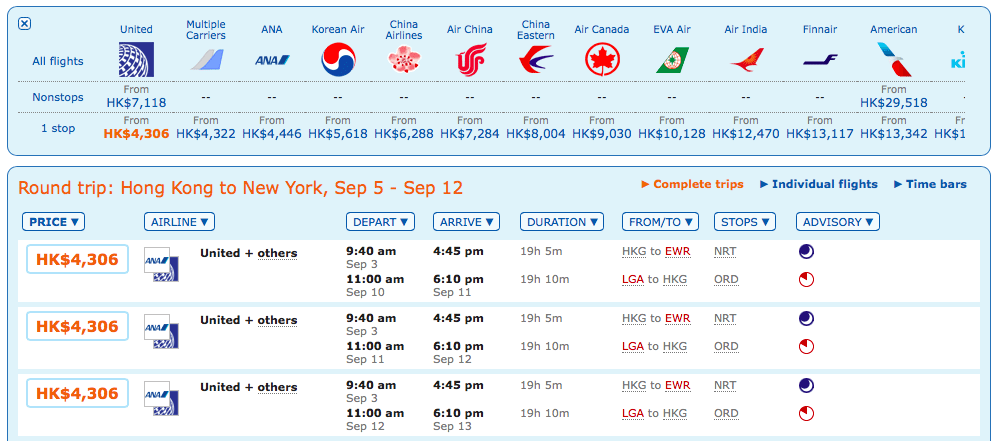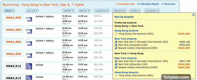 在這個例子中,我們會發現飛往 LaGuardia (LGA) 和 Newark (EWR) 是一樣價錢的,所以可以挑一個比較方便的機場。很多時候點開這裡都會有有趣的發現,例如發現可繞很遠的路在某城轉機等,建議閒時可多發掘一下。