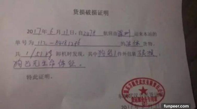 父母要求東航開死亡證明,他們卻說開不了,我後來多次聯繫多格兒寵物託運公司,可他們都是相互推卸責任,沒有一個人來處理這件事! 後來在父母的一再要求下,等到了晚上,東航才開了一張貨損破損證明。