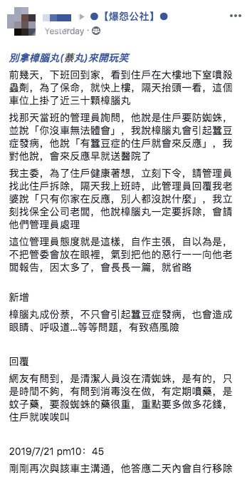 延伸文章>>車位掛滿30顆樟腦丸!社區主委「要求立刻拆掉」被拒絕 他爆氣開嗆:「不知道會害死人嗎」