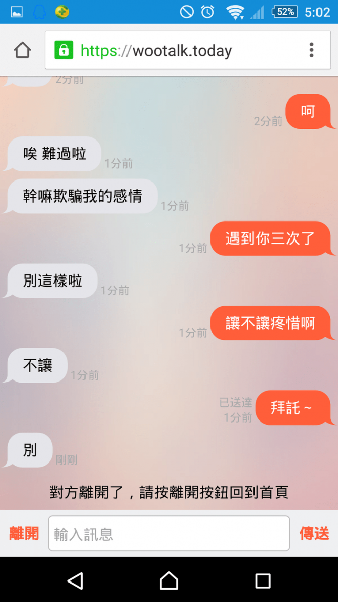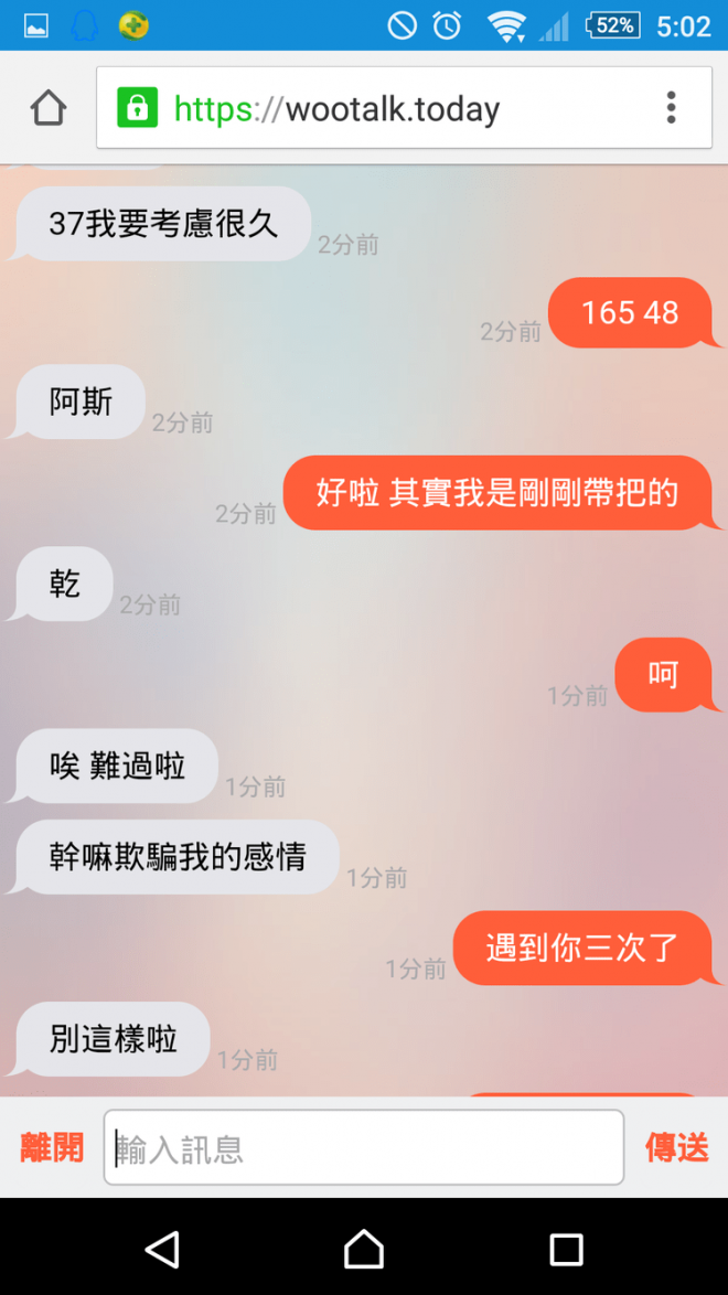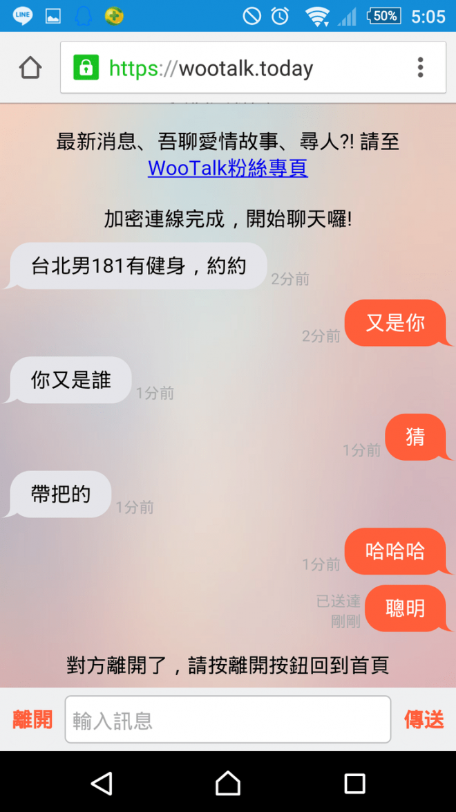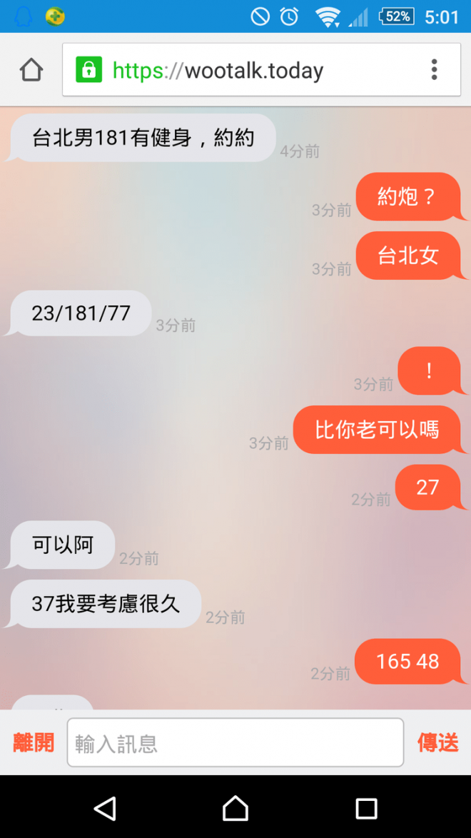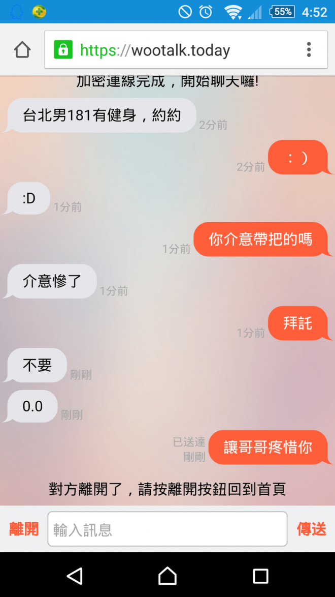不知道大家玩不玩wootalk?…我是覺得還蠻有趣的啦~大家都不知道對方的身份,我又喜歡扮成男人去play一下每次看到對方男生被我騙到然後離開都覺得很好笑XDDD。Dcard上有一位美眉約到了一位網友…但誰知道後續居然….戳中我笑點了XD