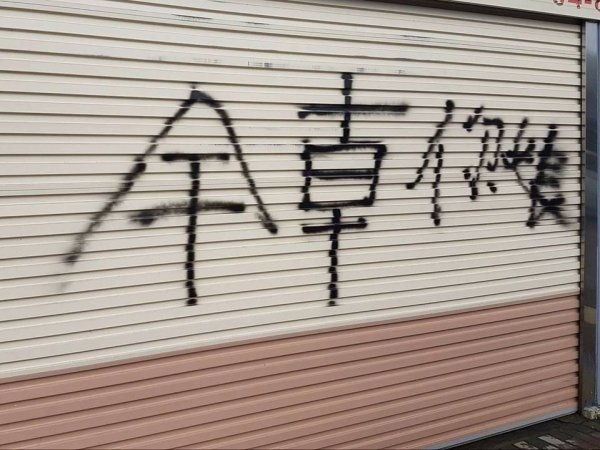 一張鐵門遭人噴上不雅字眼的照片,但仔細一看,鐵門上的「幹」字竟然寫反啦!