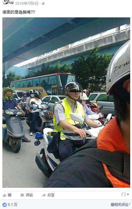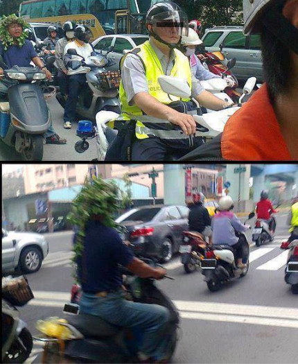 臉書粉絲團「小老婆汽機車資訊網」分享一張照片,圖中警察騎警車在等紅燈,後方卻有一位中年男子頭上明顯沒有戴安全帽,不知是否心虛怕被抓,還是一直以來的慣用的犯罪手法,竟然把草樹堆直接套在頭上,讓無數網友笑翻!